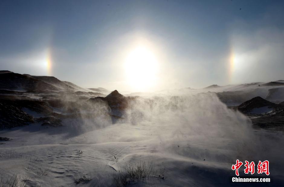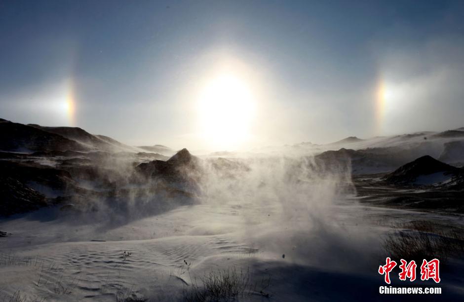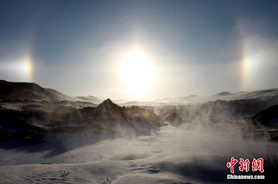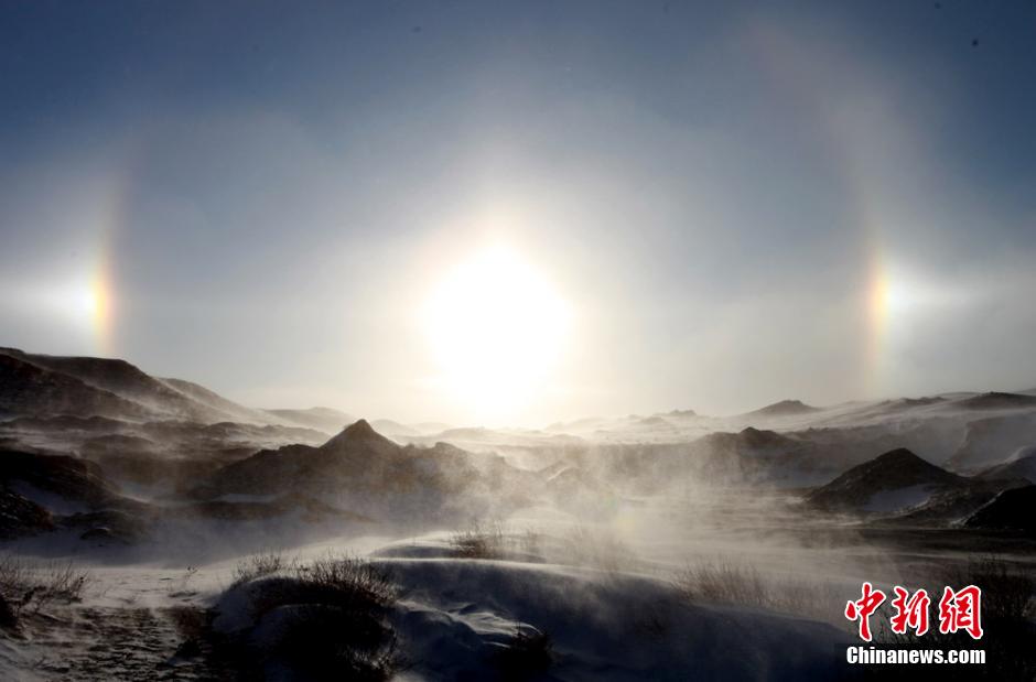 11月25日,新疆阿勒泰地区布尔津县拍摄的“幻日”景观。当天,新疆阿勒泰地区布尔津县风雪交加,气温急降零下20摄氏度,出现“幻日”现象。据了解,这种现象被称为“幻日”,是一种日晕的特殊形式。巴合提别克 摄