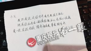 “我以前没有来过重庆,也从来没有见过小羽本人,3年来我们都是通过网络联系,但我们真的相处得非常好,我绝不相信她是个骗子。”想起小羽拿着钱不辞而别,小天一点没生气,还一直留着小羽留下的纸条。“当时有点郁闷,赌气删了她的电话和QQ,结果害得自己没法与她联系。”