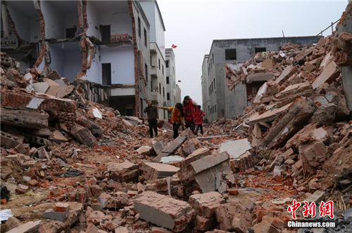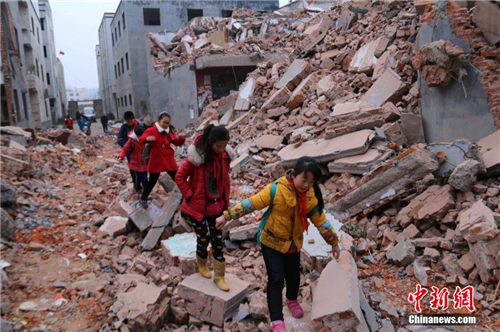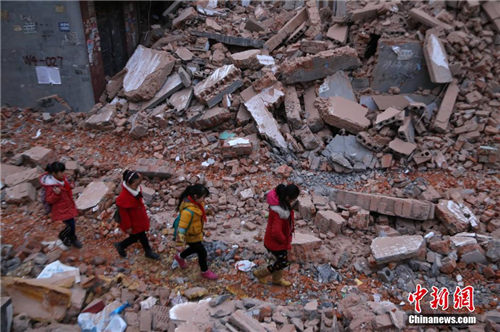 12月3日清晨,河南省郑州市管城区南十里铺花寨村,一群上学的孩子穿越布满砖头、断墙废墟的道路前去上学。由于近日拆迁方将出行道路堵上,居住在此的民众连接送孩子的自行车都无法通行。看到孩子们在几米高的残垣断壁之中通行,家长们心疼不已,过往市民也替孩子们捏把汗。据被拆迁户反映,十里铺拆迁时并未出示任何手续。一些住户的家具等物品都没有来得及搬出。 钟欣 摄