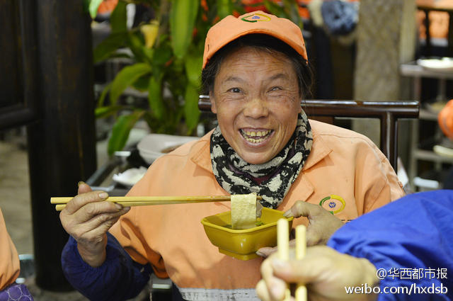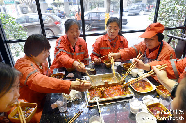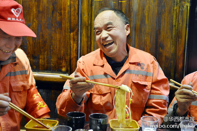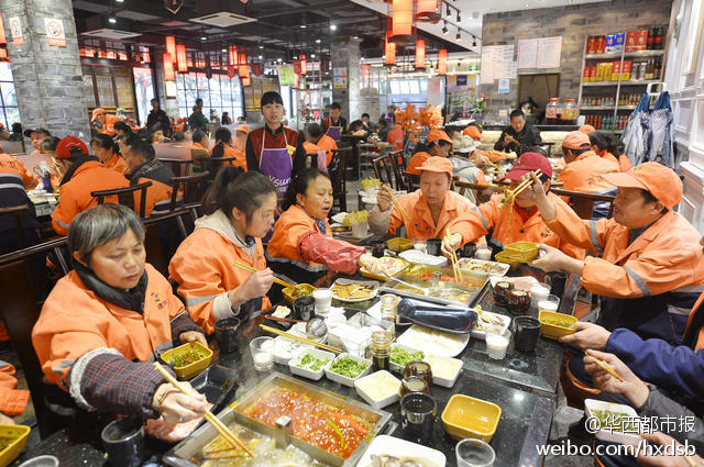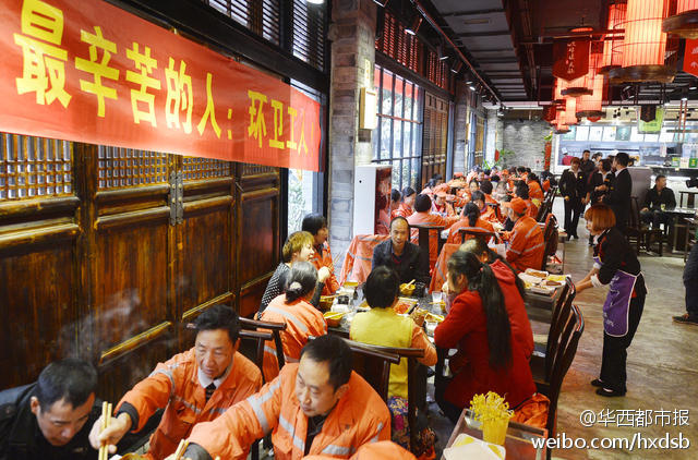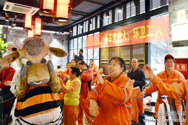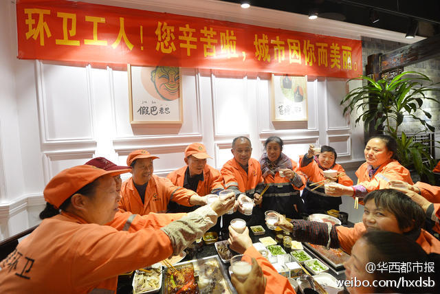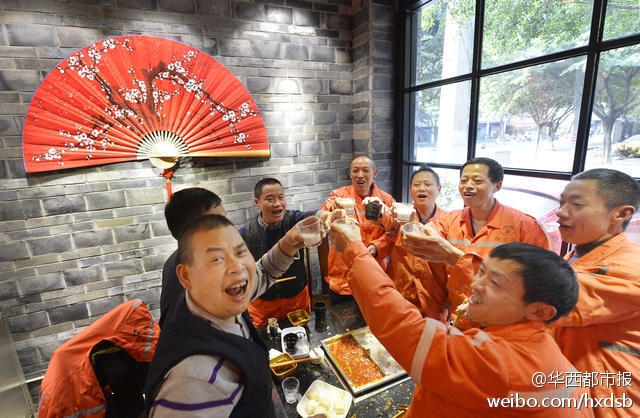 12月4日中午,成都虽然有点寒冷,但紫竹街一家火锅店内却热火朝天。老板闭门谢客,备上好酒好菜只为招待辖区180多名环卫工。席间,服务员还与环卫工同跳“最炫民族风”。