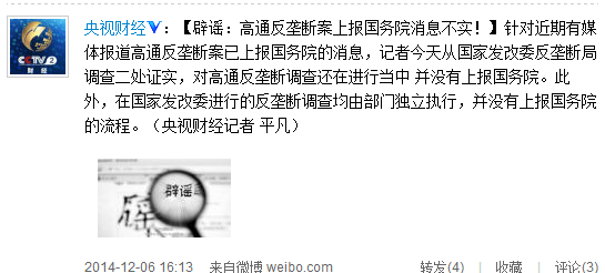 @央视财经【辟谣:高通反垄断案上报国务院消息不实!】针对近期有媒体报道高通反垄断案已上报国务院的消息,记者今天从国家发改委反垄断局调查二处证实,对高通反垄断调查还在进行当中并没有上报国务院。此外,在国家发改委进行的反垄断调查均由部门独立执行,并没有上报国务院的流程。(央视财经记者平凡)