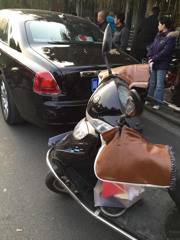 电瓶车撞上路边劳斯莱斯(图据网友微博)