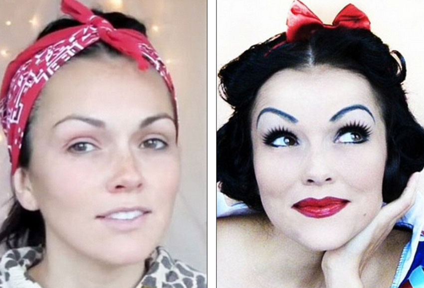 约翰逊未上妆的模样(左)与化妆成“白雪公主”的模样(右)。(网页截图)