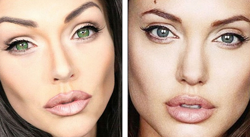 美国洛杉矶市化妆师康迪·约翰逊(左)依靠其神奇化妆术,变身安吉丽娜·朱莉(右),吸引大量粉丝。(网页截图)