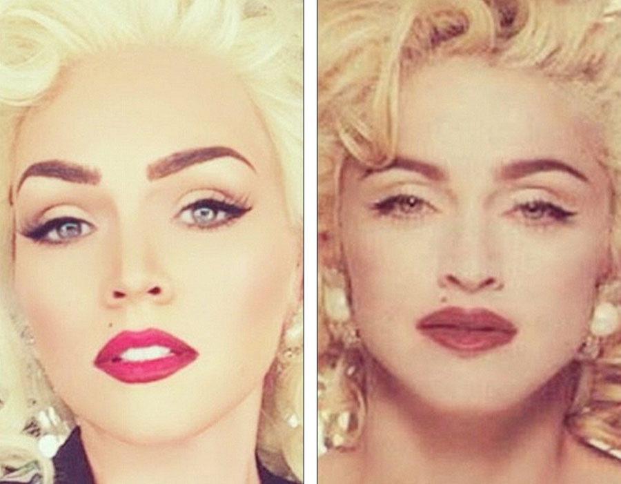 戴上珀金色假发,面部轮廓部分改变后,约翰逊(左)变成了麦当娜(右)。(网页截图)