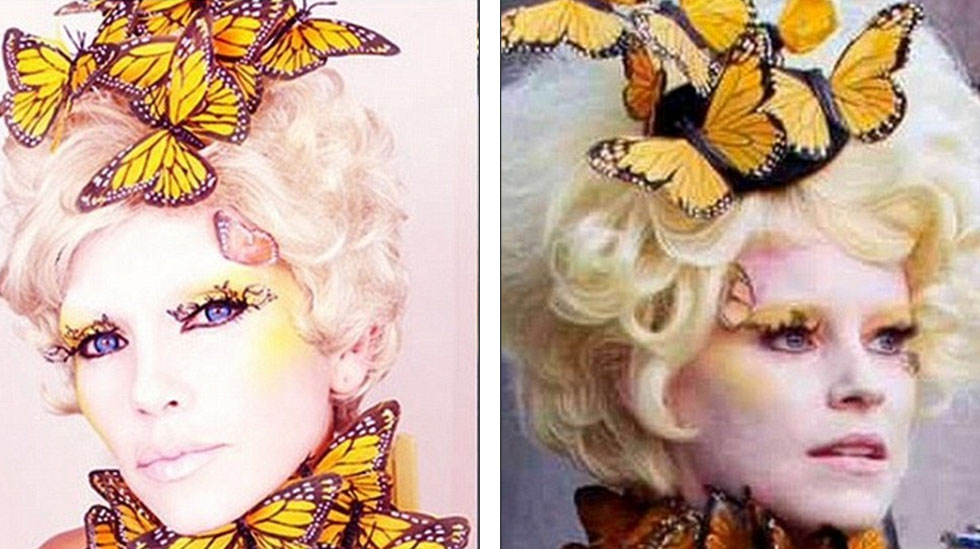 约翰逊(左)利用蝴蝶和假睫毛模仿《饥饿游戏》中的伊丽莎白·班克丝(右)。(网页截图)