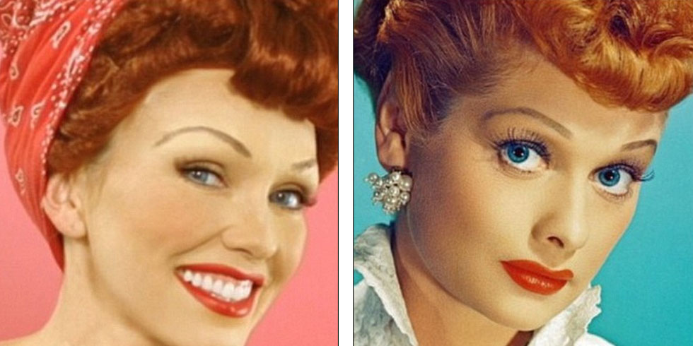 戴上假发、涂上红唇,约翰逊(左)变身20世纪50年代偶像露西·鲍儿(右)。(网页截图)