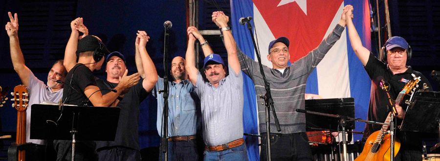 国际在线专稿:据古巴《劳动者报》12月21日报道,当地时间12月20日,古巴著名歌手西尔维奥-罗格里格斯的演唱会上邀请了5位特殊的嘉宾,他们就是15年前因间谍罪被美国抓捕扣留的5名古巴情报人员,外界称为“古巴五人组”。其中的三人是日前美国和古巴换囚协议生效后刚刚被被释放回国的。这五人的出现受到了古巴民众的热烈欢迎。