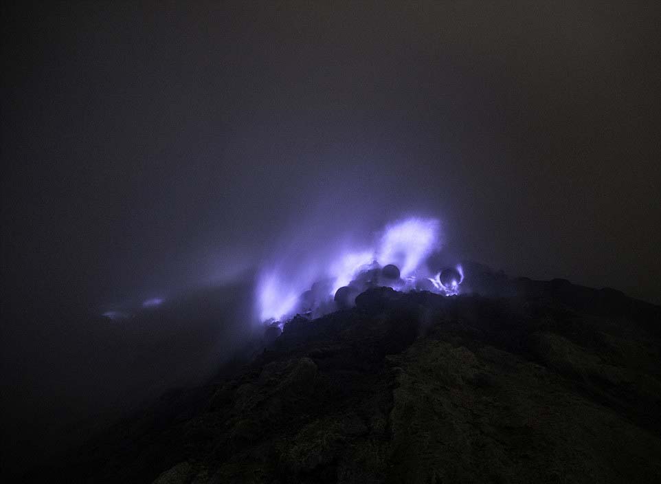 岩浆通常是橘红色,然而,伊真火山所喷发的岩浆却发出蓝色光芒。这是岩浆在火山内部燃烧所致。