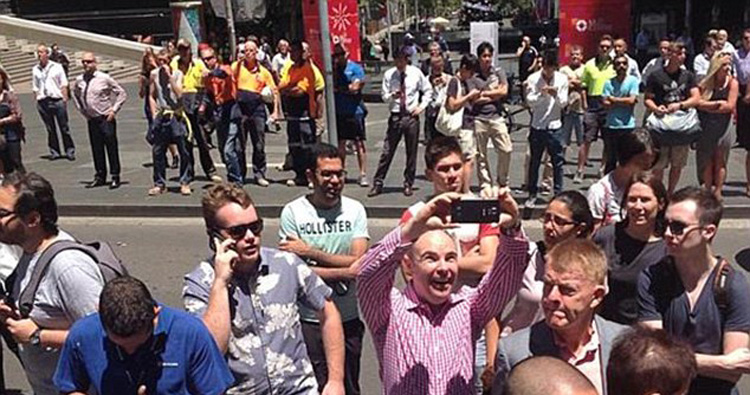 12月初悉尼咖啡馆发生人质劫持事件时,这位旁观者似乎显得很开心,举起手机自拍。