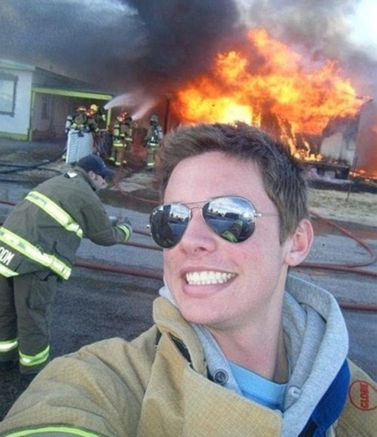 当美国消防员正在后面努力扑灭大火时,这名男子脸上带着开怀的笑容自拍。