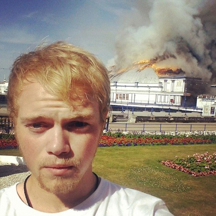 英国港口伊斯特本(Eastbourne)码头正在起火,这名年轻人却在忙着自拍。
