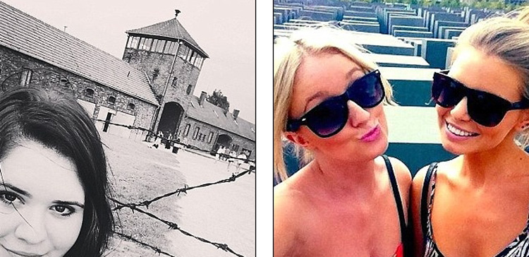 这个女孩满脸笑容地在奥斯维辛集中营前自拍。右图,2名年轻女子开心自拍,似乎已经忘记她们正站在欧洲犹太人纪念碑前。