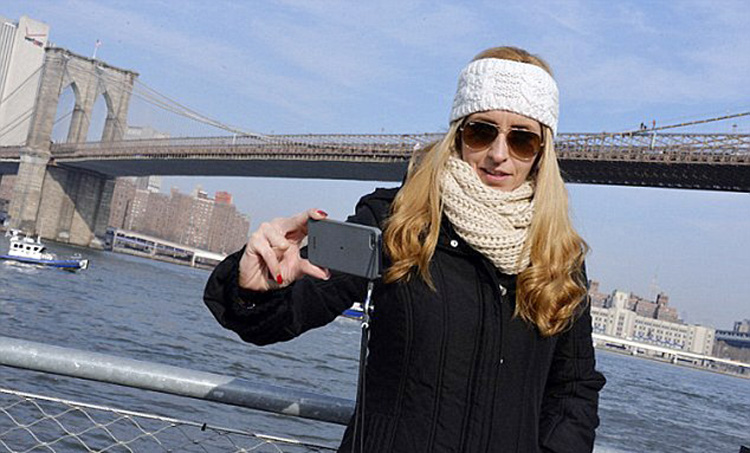 一名显然想要自杀的青年正在纽约布鲁克林大桥上,而这名女子无动于衷地自拍。