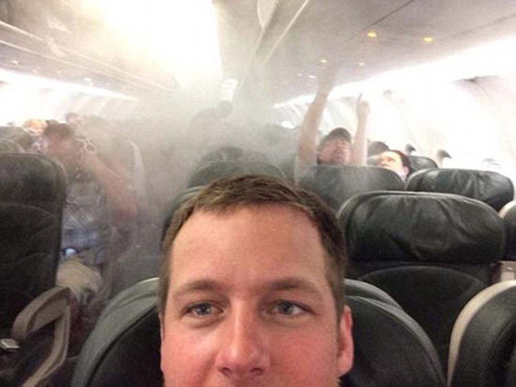 尽管这架喷气客机中充满了烟雾,但乘客依然冷静自拍。