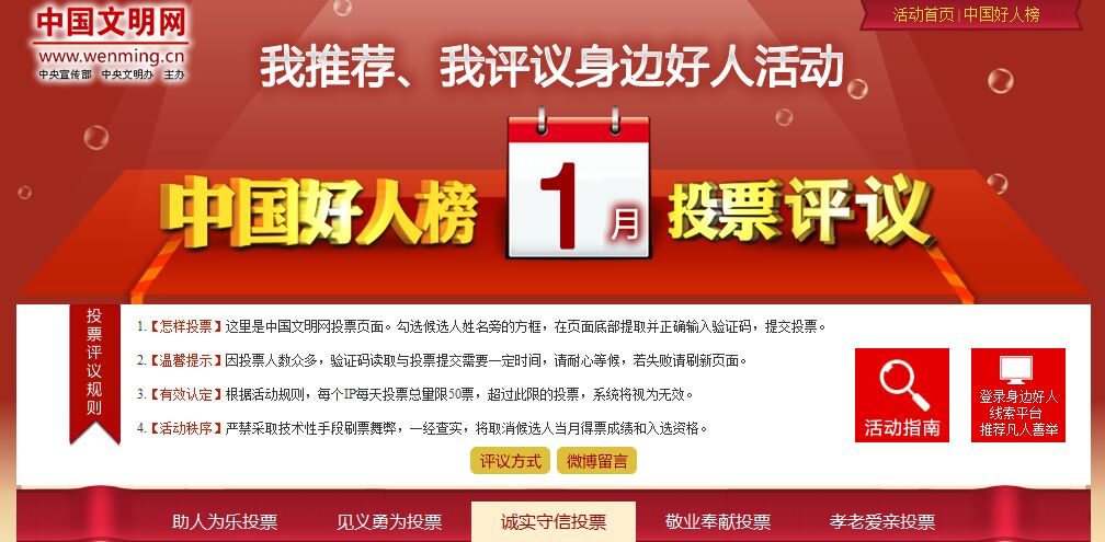 中国文明网1月1日消息(逯江楠)2015年1月1日,由中央文明办主办、中国文明网承办的“我推荐、我评议身边好人”活动2015年1月网络评议正式开始。经广大网友踊跃推荐,各省(自治区、直辖市)文明办核实情况、层层筛选,本月共推选出782名“中国好人榜”候选人。中国文明网将继续按“助人为乐”、“见义勇为”、“诚实守信”、“敬业奉献”、“孝老爱亲”五个类别,对候选人进行为期一个月的集中宣传展示。广大网友可登陆“中国好人榜”活动页面(http://archive.wenming.cn/jingtai/sbhr_news/sbhr_zrwl.htm)进行投票评议,“顶起”身边的感动人物,写下心得体会。