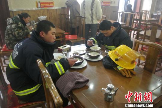 事故现场附近的老街砂锅居为消防官兵免费提供砂锅、油饼,图为消防官兵一言不发吃着饭。 魏来 摄