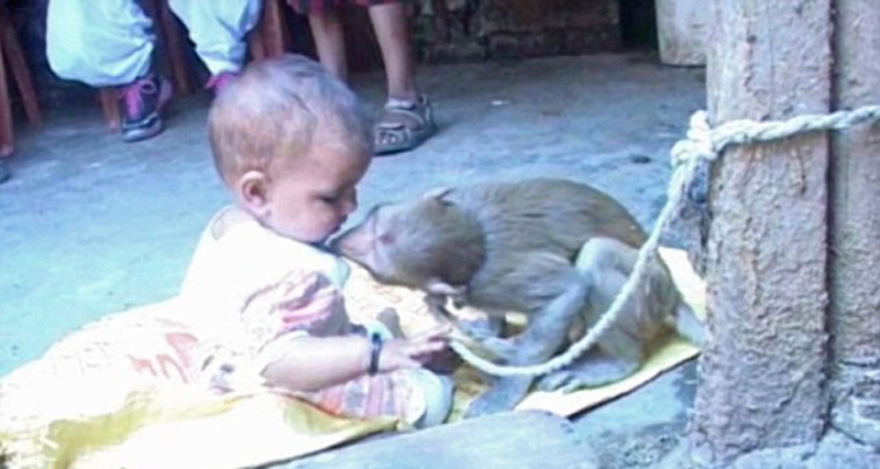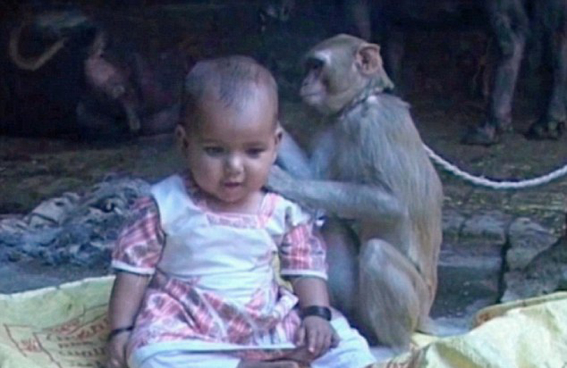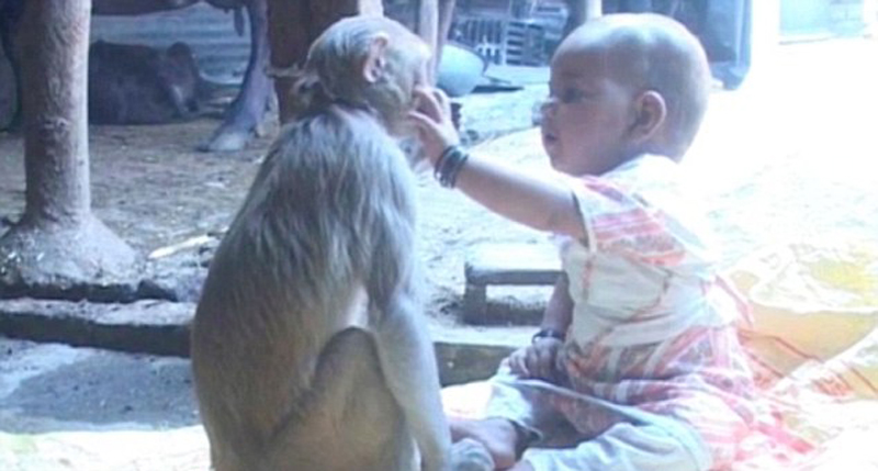 印度北部的一名小女孩和和一只猴子建立了如母女般的深厚情谊。(网页截图)