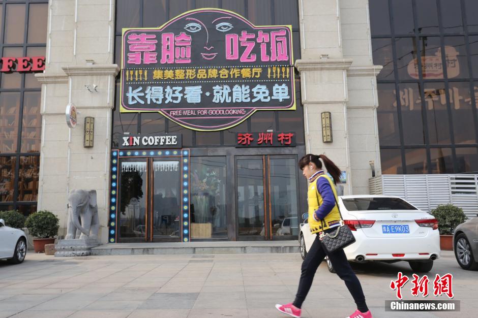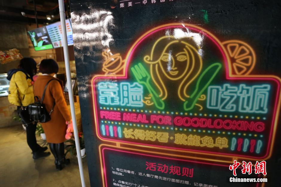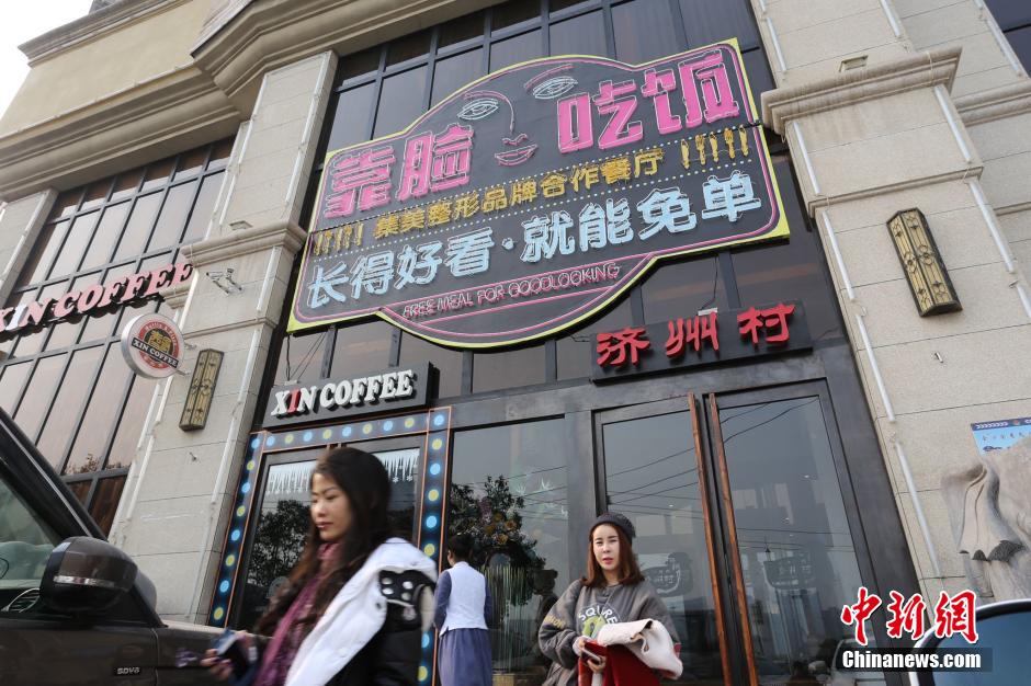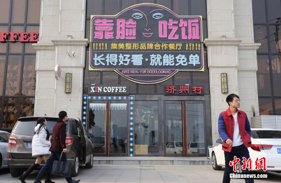 图为1月12日,郑州一家韩国餐厅在门面打出“靠脸吃饭 长得漂亮可免单”活动。 杨正华 摄