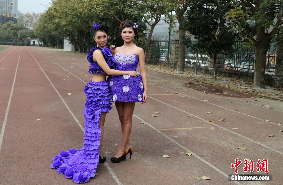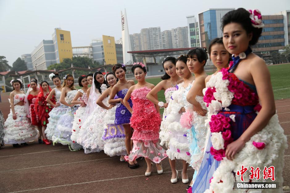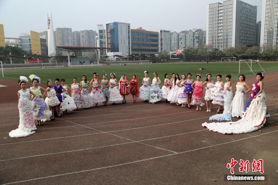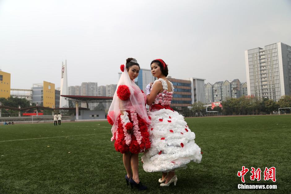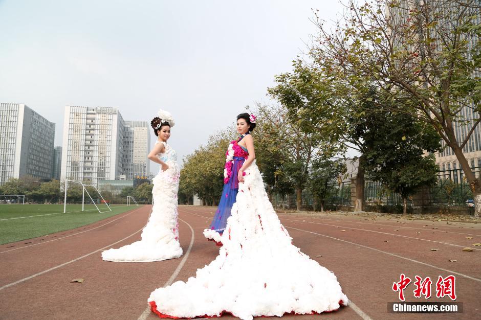 1月12日,在长达半月的准备后,成都职业技术学院26名大学生为模特穿戴好自己亲手制作的废纸婚纱,在操场集中秀出。这些将卷纸、报纸、皱纹纸等纸张制作成风格各异、外形精美的婚纱,为两年的专业学习递交上一份“最美”的答卷。中新社发 张浪 摄
