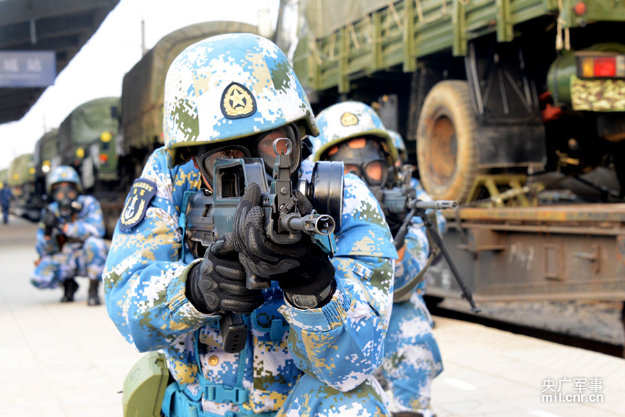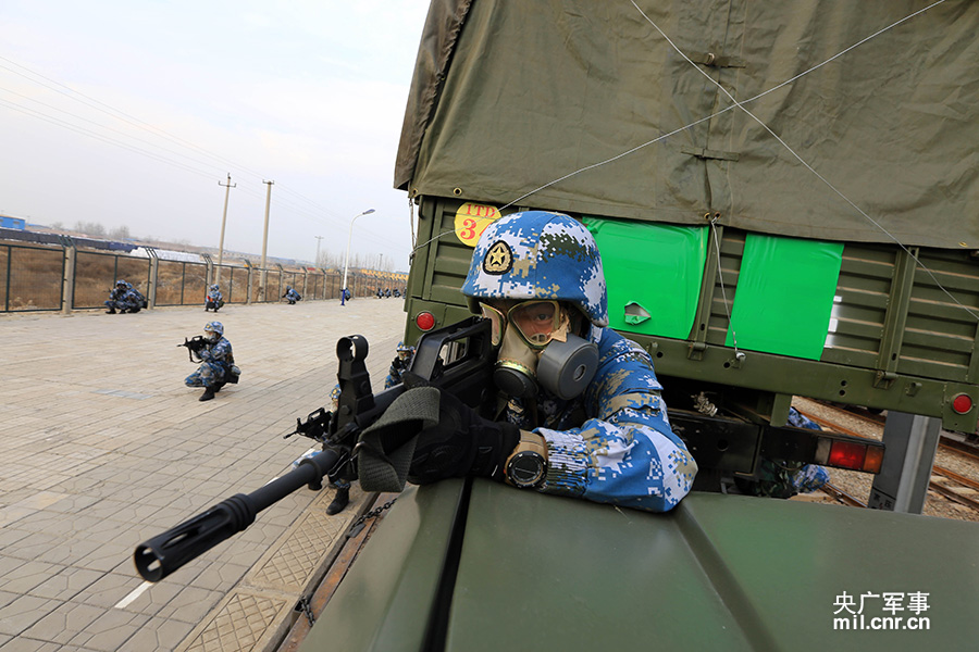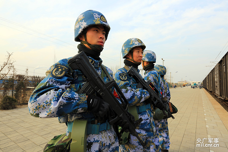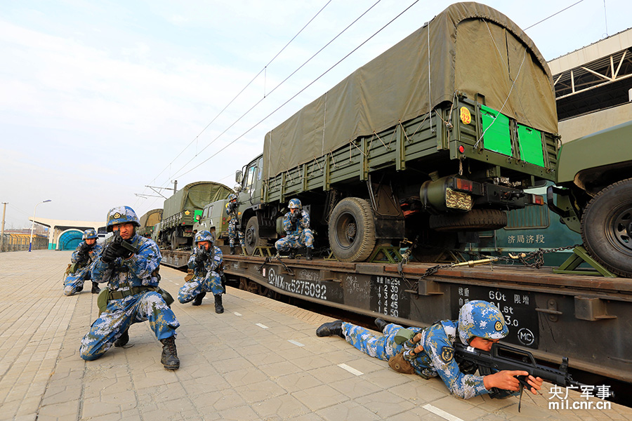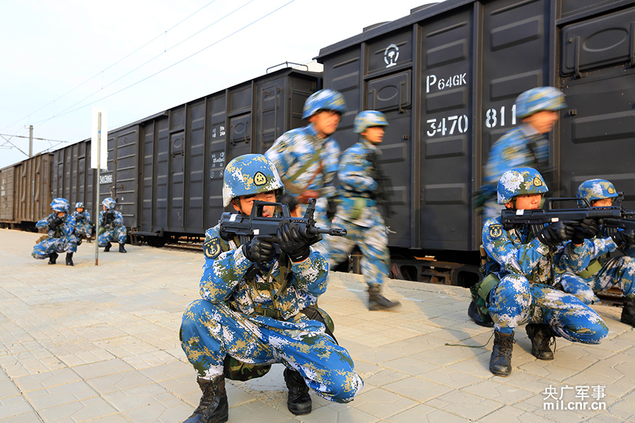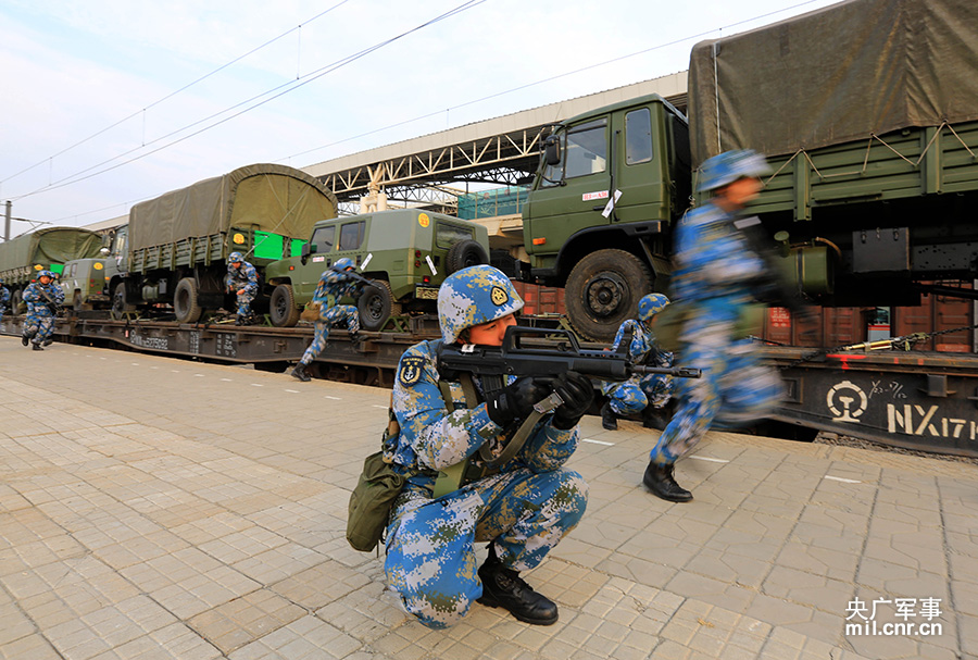 “列车后方发现不明武装分子……”1月12日下午,海军陆战队某旅寒训专列临时停靠鲁西某车站,应急分队立即启动反“敌”袭扰应急预案,果断处置特情。机动途中,该旅坚持一路走、一路练,随机设置敌机侦察、敌炮火拦阻、小股敌人袭扰等多种突发情况,锤炼官兵应急处突能力。周启青摄