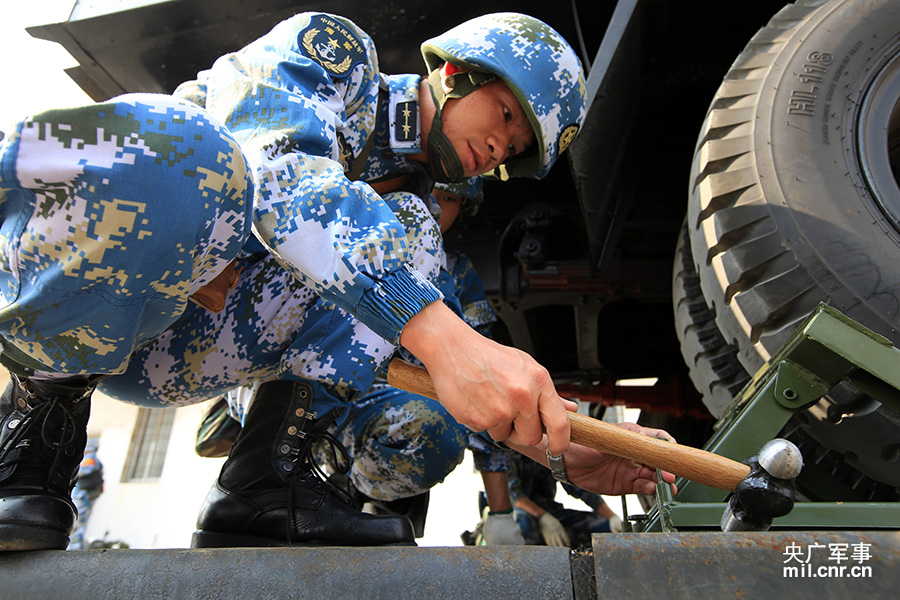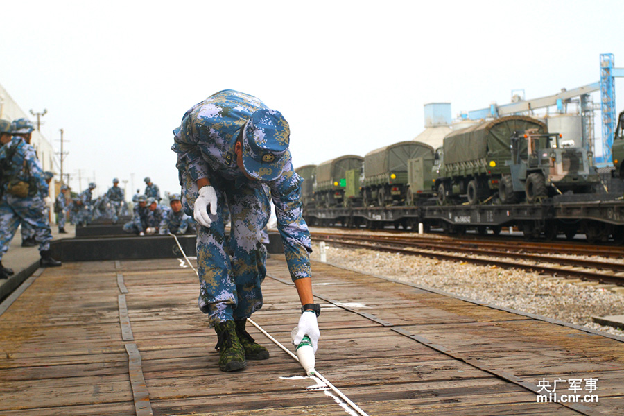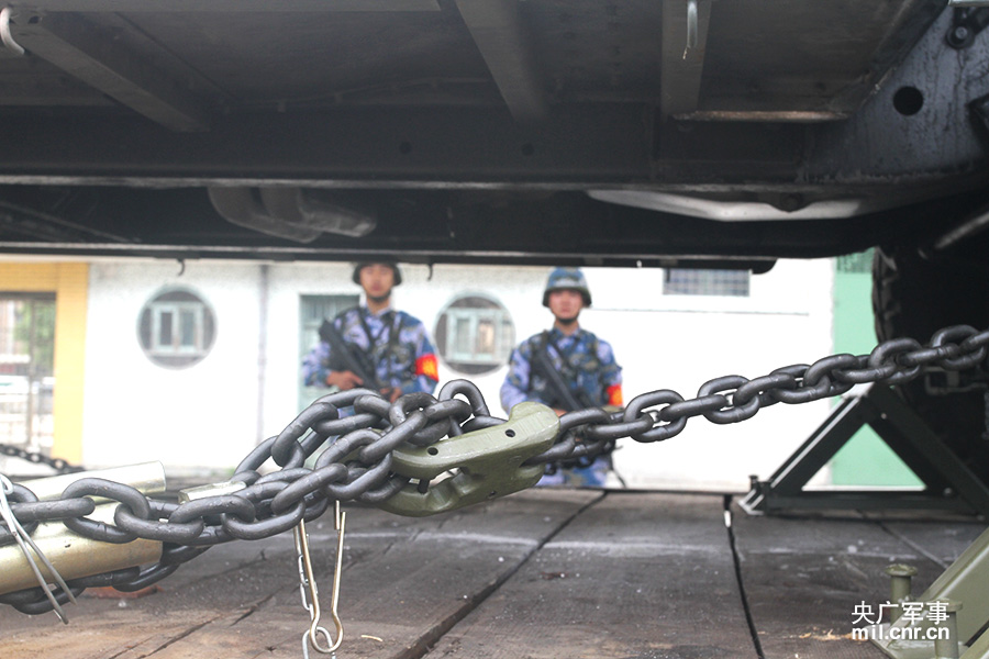 机动途中,军列的几次明显颠簸,让四级军士长谢方南对装备固定不免产生了担心。军列刚停靠山东某车站。他就迅速下车,召集几名驾驶员对装备器材进行逐一检查,认真捆绑加固。越往北走,气温越低。一下车,记者就不禁打了一个冷战。谢方南说,不光是人怕冷,这些‘铁疙瘩’也怕冷!随着往北走,温度越来越低,这些加固器材随着热胀冷缩就会逐渐收紧。如果不及时调整,就会造成固定链的崩断。为了避免以上问题的发生,部队在行进之前把所有车辆的油水都更进行了换,装载完毕后,在有条件的情况下,把车辆上的电瓶也都拆下了。因为随着长途行军车上电瓶会自放电,如果到达目的地后,车上电瓶自放电完毕了,车无法启动,就会影响整个车队的行进。