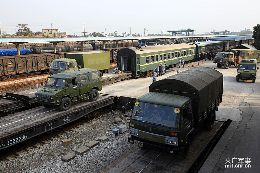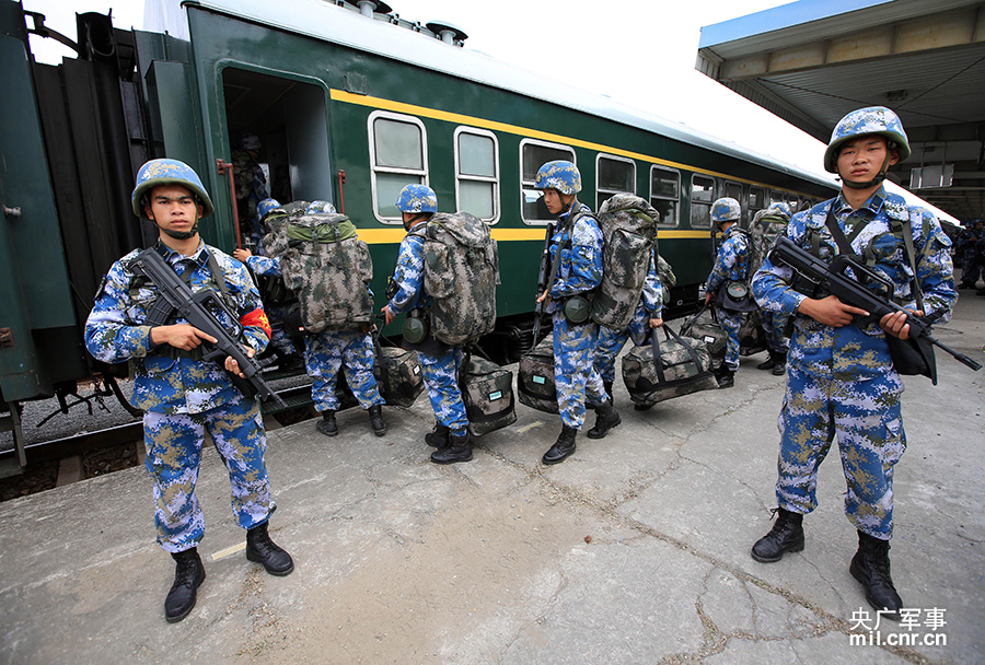 1月9日下午,海军陆战队寒训第三梯队从广东整装出发,长途机动4000余公里赴东北某训练基地开展寒区训练。图为海军陆战队某旅组织装载及出发的场景。周启青摄