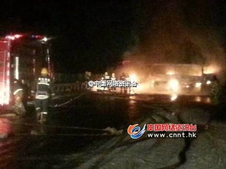 突发快讯【荣乌高速莱州段多车追尾发生爆炸 致12死4伤现场图】中国网络资讯台山东莱州1月16日电,今天晚上18时30分左右,荣乌高速莱州服务区南一公里处发生4车追尾相撞交通事故,一辆油罐车、客车和轿车相撞引起爆炸。截目前事故已造成12人死亡、4人受伤。目前事发现场多辆救护车待命。