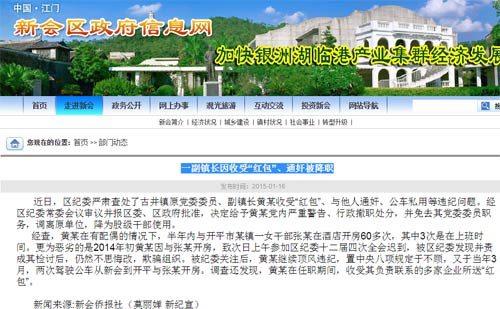 报道称,近日,新会区纪委严肃查处了古井镇原党委委员、副镇长黄某收受“红包”、与他人通奸、公车私用等违纪问题。经区纪委常委会议审议并报区委、区政府批准,决定给予黄某党内严重警告、行政撤职处分,并免去其党委委员职务,调离原单位,降为股级干部使用。