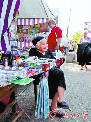 在俄罗斯五山城,一位老人正在集市上卖日用品,但顾客稀少。(赵海建摄)