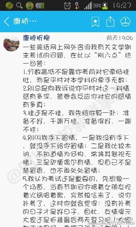 5.我认为考试还是重要的,先想象一个场面,当春节期间你陪着女朋友吃着火锅唱着歌,突然短信来了,说你补考了,这时你就会觉得:没有补考的日子才是好日子,因此,友情提示大家还是抓紧最后两天复习吧!大家都不挂最好,希望子弹永远在路上!