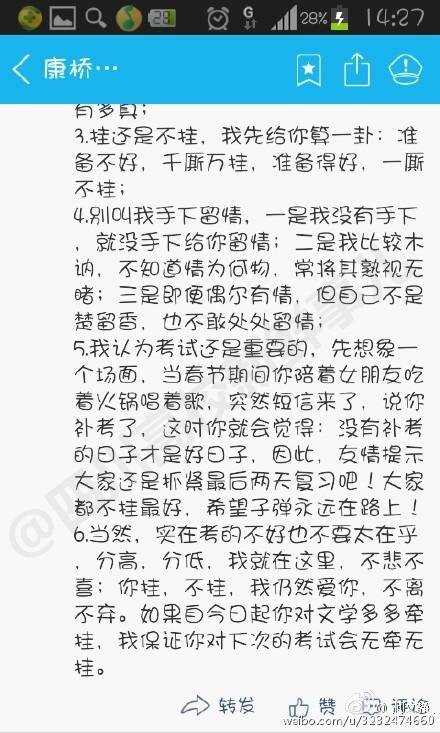 6.当然,实在考的不好也不要太在乎,分高,分低,我就在这里,不悲不喜;你挂,不挂,我仍然爱你,不离不弃。如果自今日起你对文学多多牵挂,我保证你对下次的考试会无牵无挂。