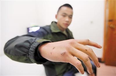 马飞在火灾现场救人受伤,手上刚拆了线的伤口清晰可见。见习记者 雷键 摄