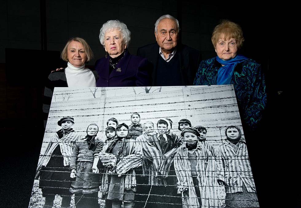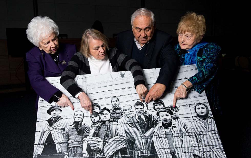 照片中的老人是81岁的保拉·列波威克斯(Paula Lebovics)、79岁的米里亚姆·捷格勒(Miriam Ziegler)、85岁的伽伯·赫希(Gabor Hirsch)与80岁的伊娃·科尔(Eva Kor)。当年解放日拍照时,他们还只是孩子。