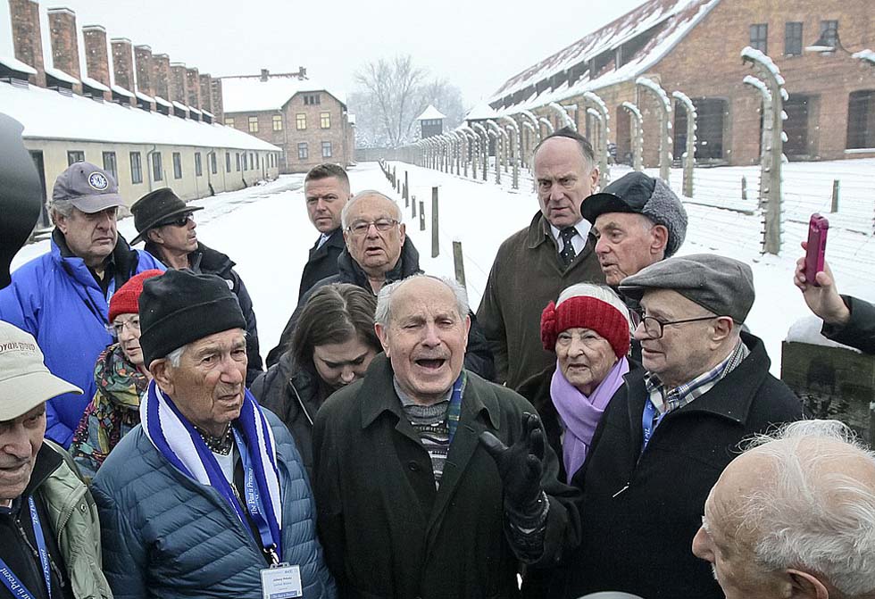 大屠杀幸存者莫迪凯·罗恩(Mordechai Rone,图中)与其他人一起在奥斯维辛集中营前祈祷。