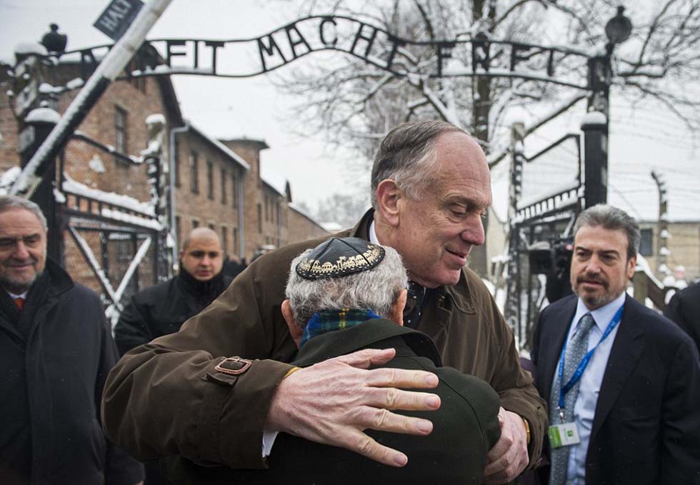 世界犹太人大会主席罗纳德·劳德(Ronald Lauder)拥抱莫迪凯·罗恩。罗恩的母亲与姐妹都在集中营遇害,当时他仅11岁。