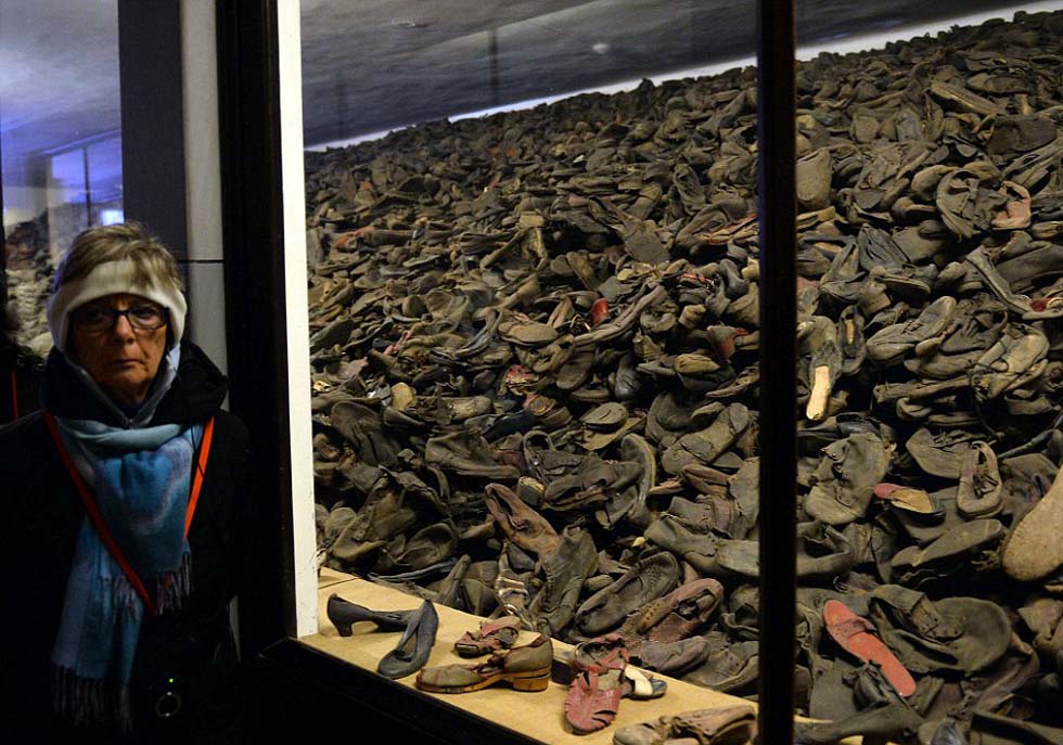 图为位于奥斯维辛集中营的纪念博物馆。这里展出了当年被囚者的鞋子。