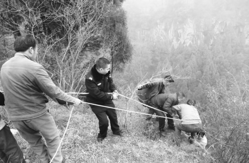 民警和徐某的父母、村干部火速赶往鹰子崖。这里是龙河镇最危险的地段,悬崖边只有一个仅容一人站立的台阶。