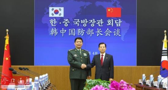 中国国务委员兼国防部长常万全(左)4日在首尔与韩国国防部长官韩民求举行会谈。