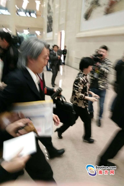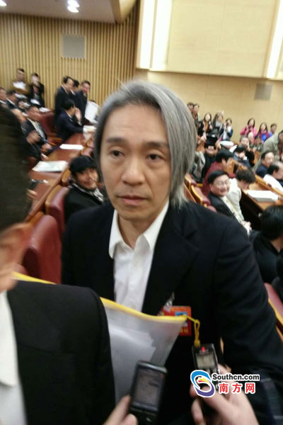 进入大堂之后,周星驰再次遭遇媒体的“包围”,寸步难行。他找不到自己的位置,媒体记者也一直在他身边不离去。据周星驰透露,他今年参会也带来了提案,但他并未透露提案的内容。听会时,有人不断请他签名,他连续签了两个之后,小声示意有工作人员在旁,小声说“在听(会)呢”。