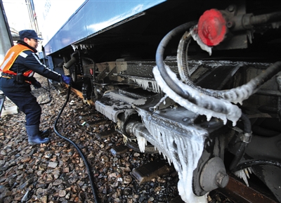 昨日,北京站火车上水工冯国军正在为车厢上水,车底管道已结冰。新京报记者 王贵彬 摄