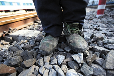 走得困难,记者就往铁轨上走,感觉轻松不少,但很快被冯国军叫下来。他说他们这行规矩之一就是禁走铁轨,不管多累,也不能靠近铁轨,“不知道什么时候来车。”冯国军说,还有个规矩就是车动人不动,遇到来车,马上停下脚步,等车过后再工作。
