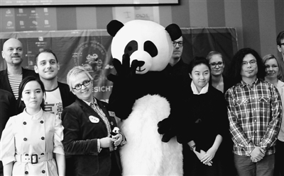 一位大熊猫爱好者打扮成卡通人物同部分参赛选手合影。
