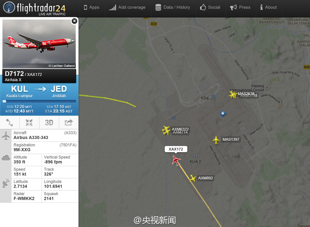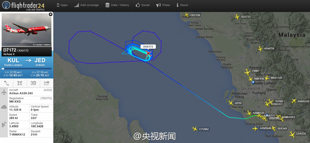 亚航X的一架飞往沙特红海沿海城市吉达的航班因机械故障,在马六甲海峡上空盘旋约5小时后,安全降落在马来西亚吉隆坡第二国际机场。