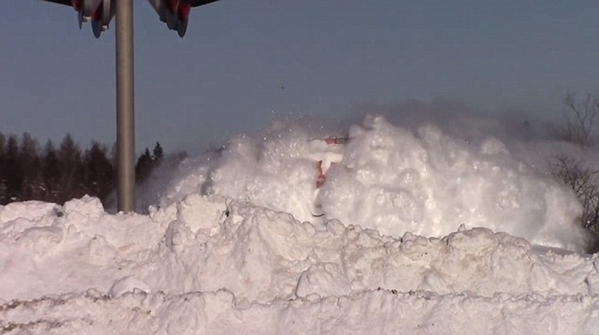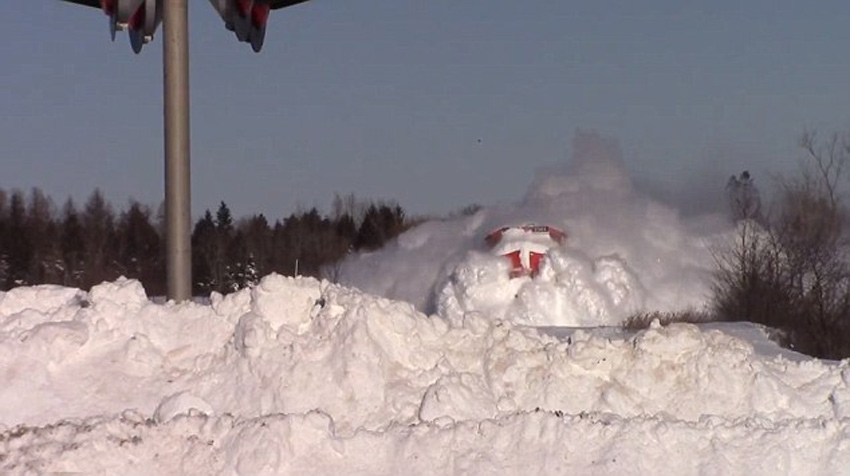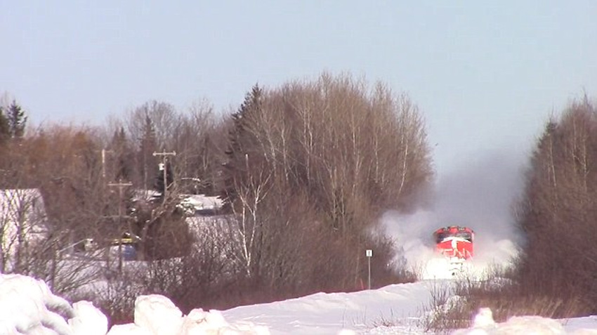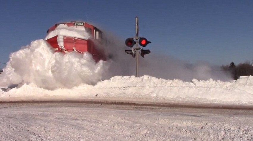 位于新伯伦瑞克省某处的轨道上,有大量堆积的雪,在红色货运列车高速经过时,不断撞击出白茫茫“雪雾”。