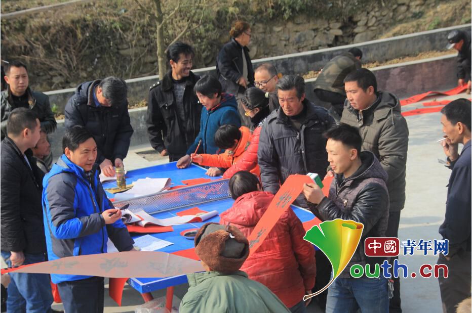 在第二站,志愿者们搭起了台子,持续为当地贫困群众发放爱心物资,特别是现场义诊、拍摄全家福、书写春联等活动场面火爆,拥满了大堆人群,老人、小孩儿一个个像乐开了花似的。志愿者们一个个精神饱满,忙碌并快乐着,中午只匆匆以自带的零食充饥。直到下午4点多才给乡亲们挥写完最后一副春联。