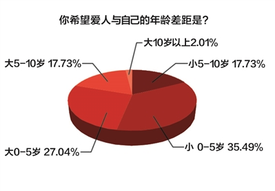 大数据对于这一现象也给予了“全揭秘”。“你希望爱人与自己的年龄差距”调查中显示,16.5%的被访男女能接受“姐弟恋”,在女性被访者中,6.27%的人能够接受自己比男朋友大5岁以上,9.18%的未婚女性能接受自己大于男性0-5岁。同样,在男性被访者中,5.99%的人能够接受女性比自己大5岁-10岁,8.77%的未婚男性能接受女性大于自己0-5岁,有2.56%的男性甚至可以接受女伴年龄比自己大10岁。