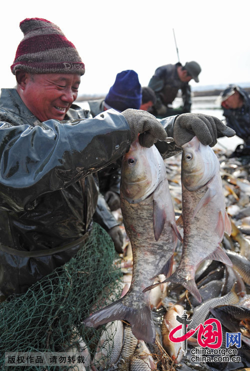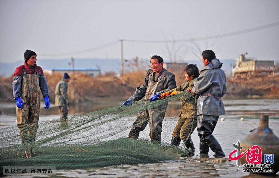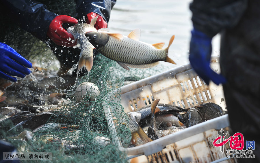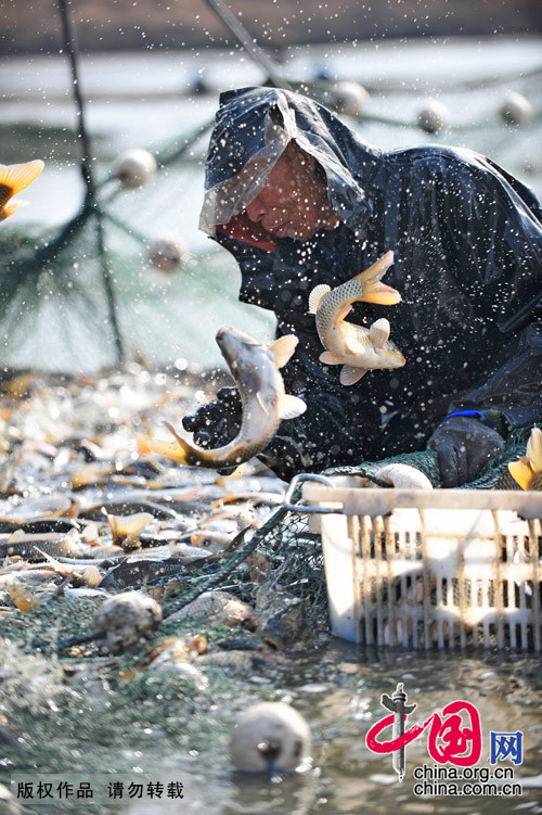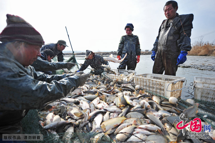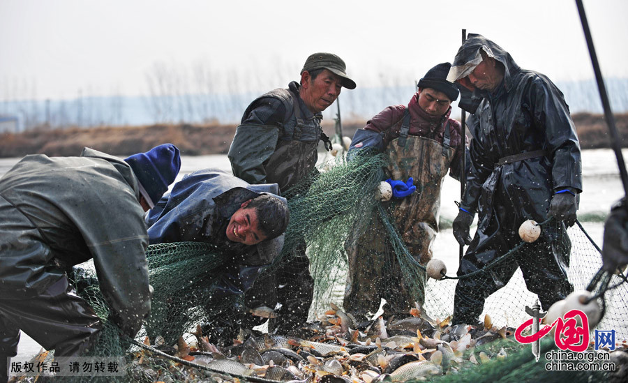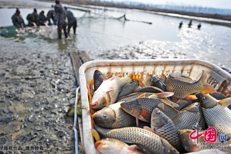 2015年2月7日,河南孟津县会盟镇万亩无公害黄河鲤鱼养殖基地内,“打鱼队”队员仔细捡鱼装筐。中国网图片库 黄政伟摄影