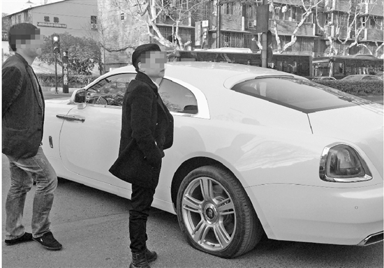 这时,劳斯莱斯车主下来了,一位男士,个子不高,穿件黑衣服,走到刮擦的地方看了看,发现车子左侧油漆刮掉了,左后轮被电瓶车上的铁杆戳到了。