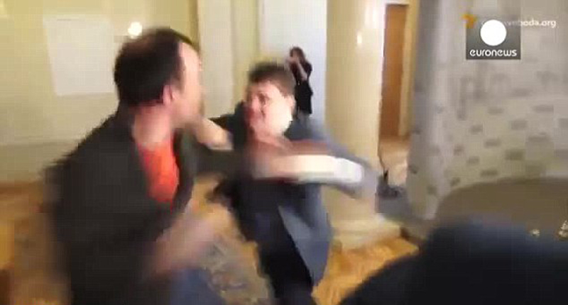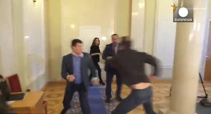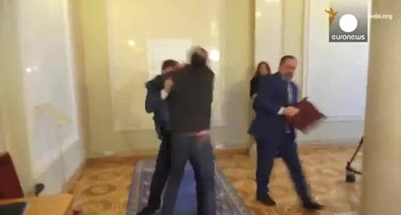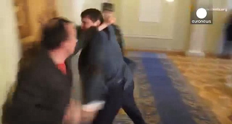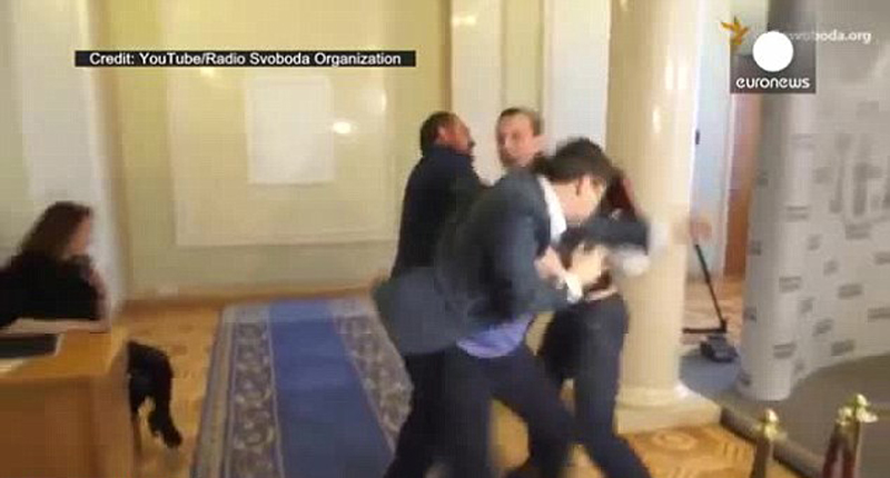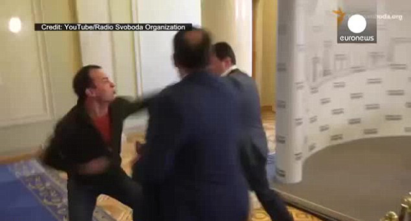 索伯列夫与伊夫琴科在乌克兰最高议会大打出手,一名警卫试图将他们分开。